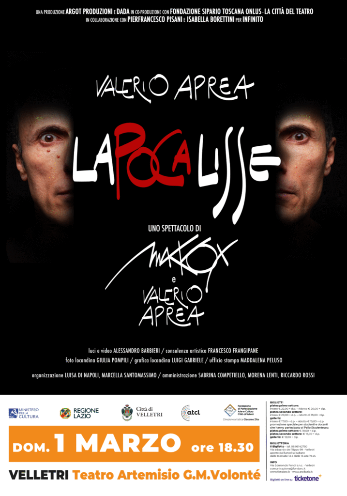 Il testo, oltre al grande artista in scena, è stato curato anche da Makkox con la consulenza artistica di Francesco Frangipane ed è prodotto da Argot Produzioni e Dada in co-produzione con Fondazione Sipario Toscana onlus – La Città del Teatro e in collaborazione con Pierfrancesco Pisani e Isabella Borettini per Infinito. Tutto muove da una consapevolezza: l’apocalisse è imminente. Ma siamo proprio sicuri? Davvero non c’è un barlume di speranza? Un minimo spiraglio di possibile intervento per scongiurare un destino che sembra ineluttabile? E se sì, a quali condizioni? Attraverso quali ostacoli? Siamo ancora in tempo per correggere la rotta? Ma poi, soprattutto, la vogliamo davvero correggere questa rotta? Dalla scienza e al suo opposto, dagli algoritmi alle abitudini quotidiane, dalla politica al progresso e l’inerzia che lo frena, Valerio Aprea porta in scena una serie di monologhi scritti per lui da Marco Dambrosio, in arte Makkox in un assolo iperbolico attorno al concetto di cambiamento, necessario ad affrontare il buio che ci minaccia laddove comicità e assurdo divengono strumenti affilati per affrontare e provare a scongiurare il grande spauracchio dell’apocalisse.